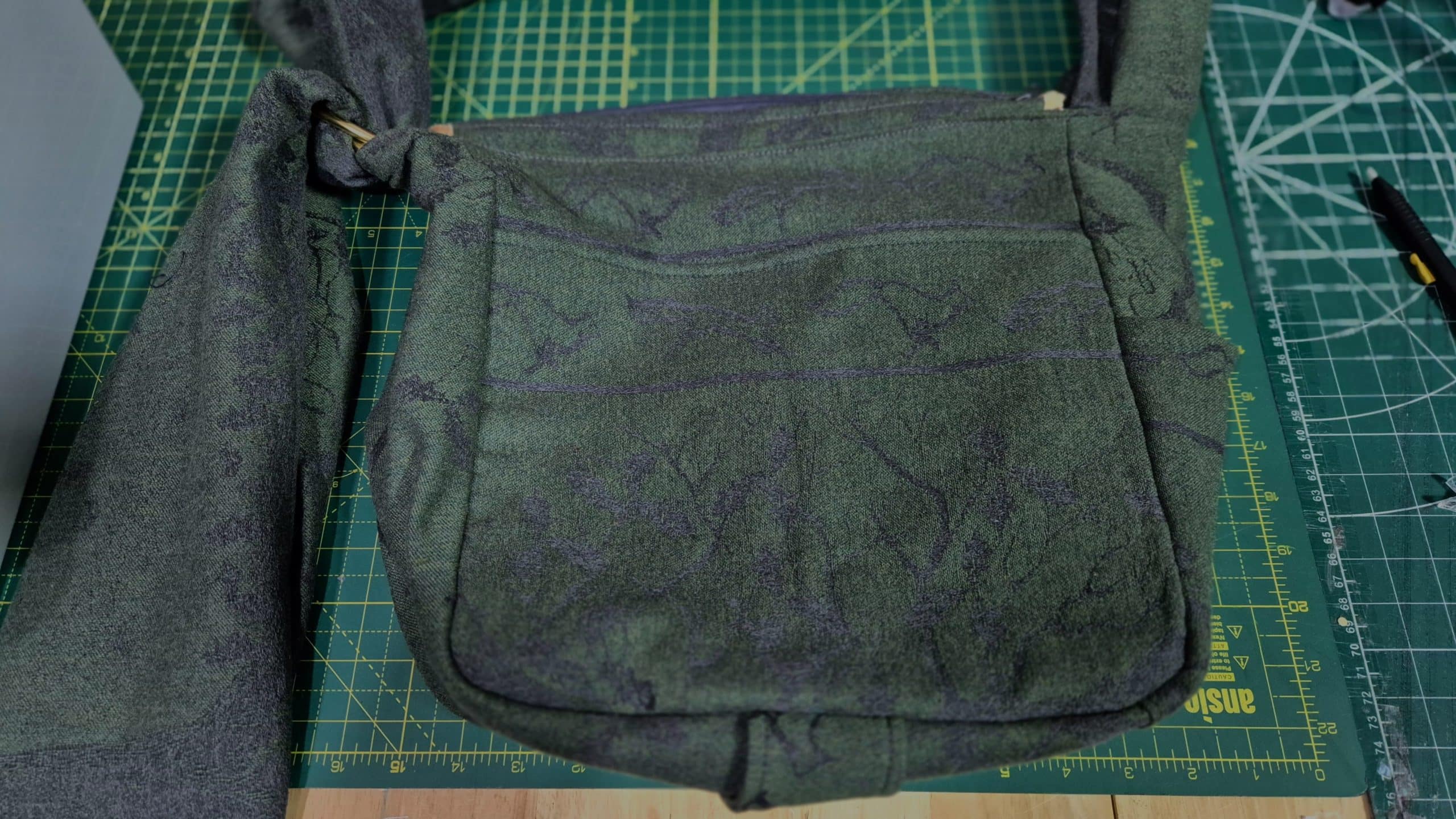 This pattern was designed to be used with babywearing woven cloth, but can be used with any fabric that is practical for bag making – not stretchy or too fine. The pieces, when drawn out on a standard 2 metre x 70cm section of babywearing cloth, tessellate together, leaving very little waste fabric. Many of the Firespiral Slings cloth pieces lend themselves well to this design, as the patterns are repeated and the panels can be cut in a way to hide mismatched patterns. The more intricate the design, the harder it is to match up. These instructions will show you how to lay out the pattern to make an Absolute Bobbins Babywearing Bag, with an open front pocket and ring-adjustable cross-body strap.